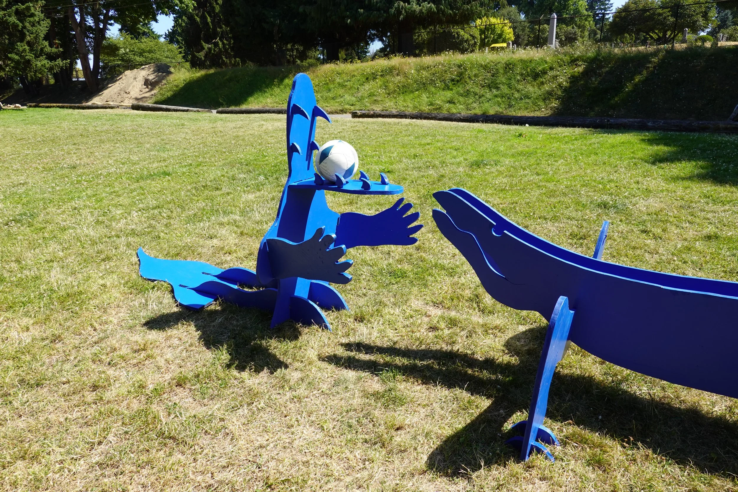 “Alligators Luden Ludos” - Park-scale marble shoot for playground balls, full-scale mock-up. 4’ x 3’ x 25’ plywood, acrylic paint, soccer ball, and one gregarious Poppo.